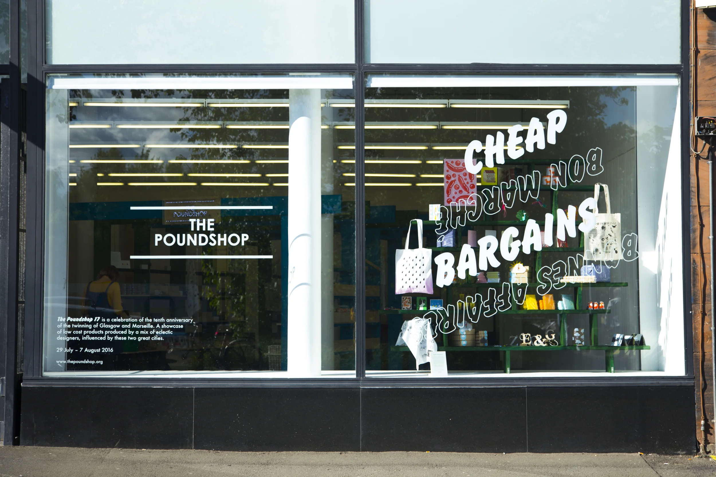 In July 2016, The Poundshop set up shop at South Block, Glasgow, in collaboration with Wasp Studios for Merchant City Festival 2016. The Poundshop 17 celebrated the tenth anniversary of the twinning of Glasgow and Marseille and showcased low cost products produced by a mix of eclectic designers, influenced by these two great cities. This was the first time The Poundshop appeared in Scotland, boasting a unique interior created by local designer Steff Norwood.The Poundshop 17 was a great opportunity to lay hands on specially curated products with everything selling for £1, £3 and £5.